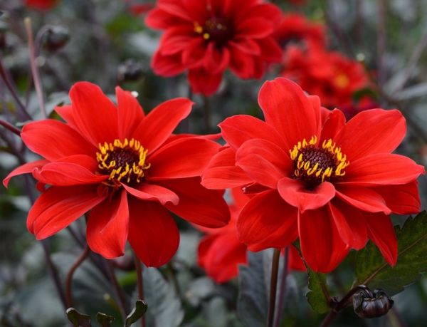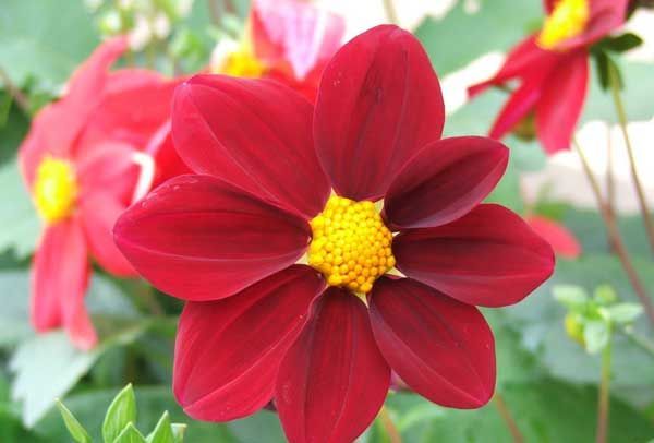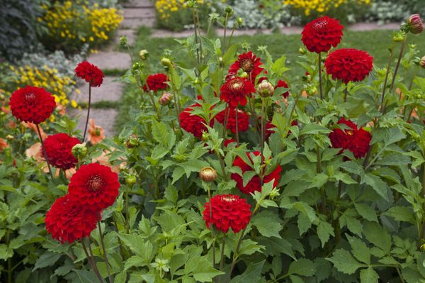 Le dahlia appartient au groupe des plantes à croissance lente. Les fleurs rouge vif ont un diamètre de 12-15 cm.