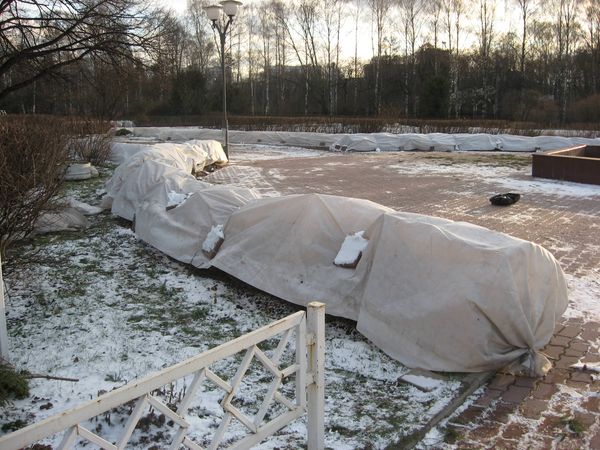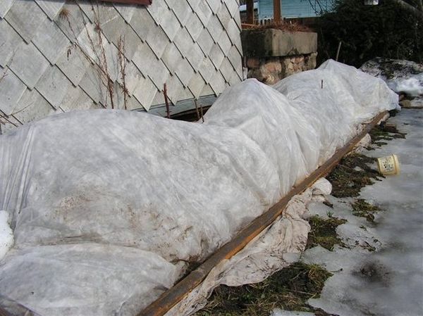Dans les régions centrales de notre pays (par exemple, dans la région de Moscou), une méthode de cadre est utilisée pour l'abri. Les pousses sont pliées au sol et des arcs de cadre sont installés au-dessus d'eux, qui, à leur tour, sont recouverts d'un matériau non tissé offrant une protection fiable.