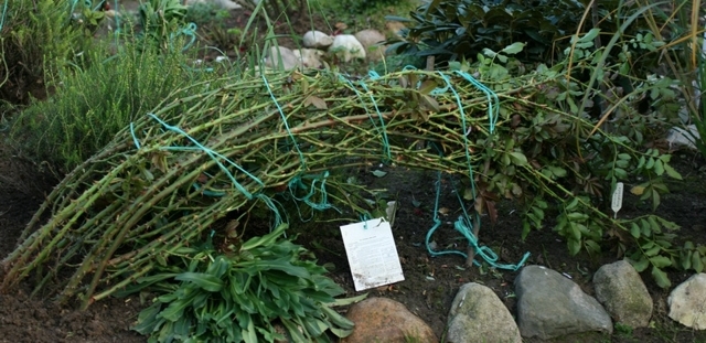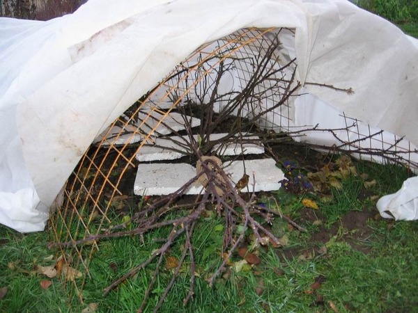 Vous pouvez mettre une sorte de matériau de couverture sur la couche de feuillage. Frotter les roses se plier et se lier de la même manière que les framboises : en tirant les branches les unes vers les autres ou les supports.
