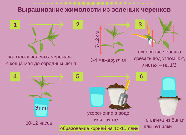 La récolte des boutures tombe en mai-juin. La longueur de coupe optimale est de 20 cm.Chaque pousse doit avoir plusieurs bourgeons sains. Après la coupe, les boutures sont immergées dans la solution d'enracinement. Les racines apparaissent après 12-15 jours. Les boutures peuvent maintenant être plantées dans des mini serres.