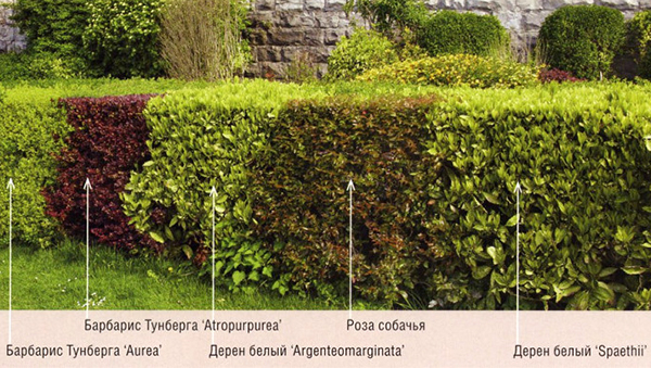 Dans chaque cas, différents arbustes de haie sont plantés : feuillus, résineux, fleuris, avec des pousses grimpantes. Ils ont tous leurs propres caractéristiques, qui seront discutées ci-dessous.