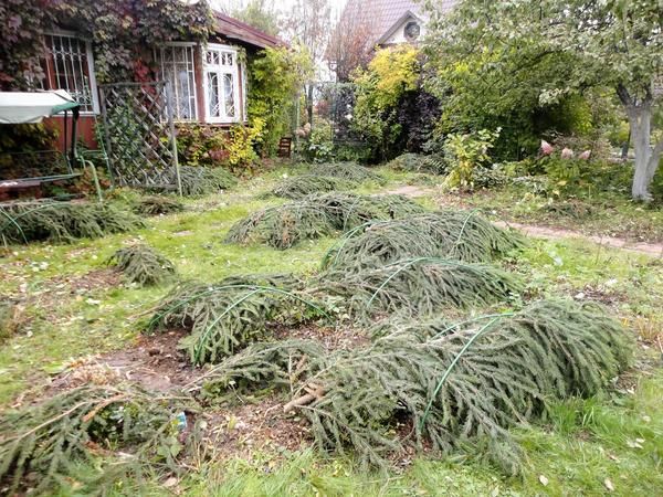 Avant de couvrir les cultures de jardin, il est important de préparer les plantes. Les branches des arbres et des buissons étalés doivent être attachées avec de la ficelle, isolées avec de la toile de jute. Après cela, vous pouvez passer aux branches d'épinette.