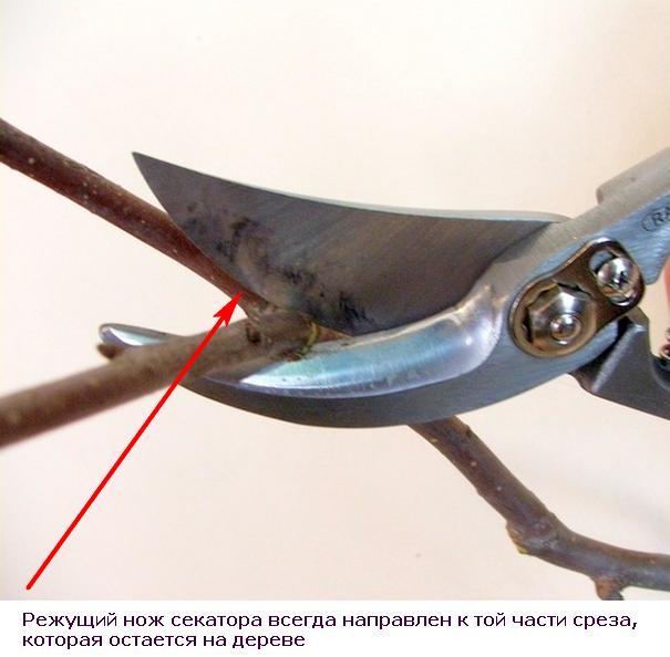 La taille du jardin ne doit être effectuée qu'avec des outils tranchants. Dans le ménage de tout jardinier qui se respecte, il devrait y avoir des sécateurs, des cisailles de jardin et une scie à métaux de jardin (juste une scie de jardin, avec une lame spéciale, une scie à métaux domestique ordinaire ne convient pas à un travail aussi délicat). Habituellement, la partie coupante de l'outil est positionnée vers la partie de la branche qui reste. L'outil doit être positionné à un angle d'environ 45 degrés. La coupe doit être faite presque à côté du rein et ne pas laisser un gros chanvre au-dessus.