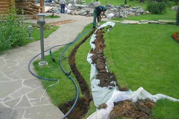 L'installation de l'arrosage automatique de la pelouse commence par le marquage du territoire selon un projet préalablement préparé. Tout d'abord, les emplacements du pipeline sont marqués et la profondeur de tranchée requise est creusée. Parfois, cela peut être obstrué par des racines d'arbres ou de grosses pierres. Dans le cas où ils ne peuvent être éliminés, le plan de pose des canalisations doit être adapté.