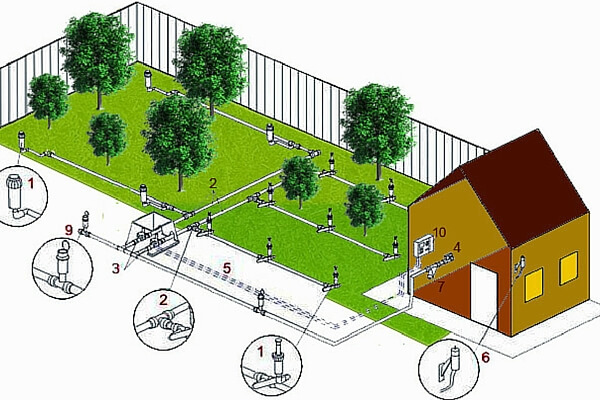 L'alimentation en eau des arroseurs s'effectue par des tuyaux en plastique situés sous terre. Puisqu'ils restent sur le site d'installation du système toute l'année, il est conseillé de les placer à une profondeur inférieure au point de congélation du sol. Cependant, si pour une raison quelconque cette option n'est pas possible, les tuyaux peuvent être placés à une profondeur d'environ 25 cm. Il convient d'utiliser des tuyaux en polyéthylène basse pression, faciles à plier et connectés tout simplement à l'aide de raccords à compression, ce qui est important. lors de la pose de vos propres mains.