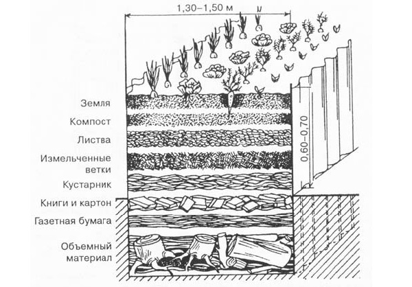 Les composants optimaux de la tranchée peuvent être les couches suivantes (de bas en haut) : des parties d'un matériau volumineux (chanvre, grosses branches, etc.), une couche de papier (journaux, vieux livres abîmés, carton), des parties de un arbuste, des pousses déchiquetées, du feuillage, du compost et de la terre.