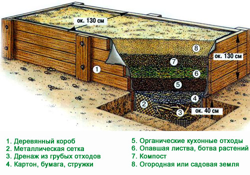 La boîte à cadre est remplie de terre et de matière organique et est abondamment humidifiée. Au printemps, la structure est recouverte d'un film pour accélérer le déroulement des processus biologiques. Pour l'hiver, recouvrez d'un film sombre pour que les mauvaises herbes ne germent pas.