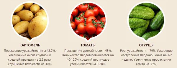 Le résultat de l'utilisation de cet outil est une augmentation du nombre de graines en germination, ainsi que du rendement (par exemple, le rendement des tomates traitées avec cet engrais a augmenté de moitié). En outre, l'outil est capable d'activer la croissance des pousses et d'augmenter l'immunité des plantes, en les protégeant des maladies et des ravageurs. Un autre avantage incontestable est la beauté et l'esthétique des fruits, ainsi que l'amélioration de leurs caractéristiques gustatives.