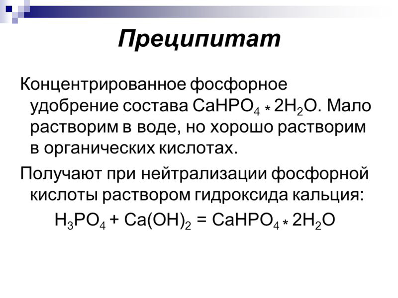 Le précipité est une composition de phosphore concentrée, qui est activement utilisée pour nourrir toutes les plantes fruitières. La formule chimique ressemble à ceci : CaHPO4 2H2O. L'élément est formé à la suite de l'interaction de la craie ou de la chaux avec de l'acide phosphorique.