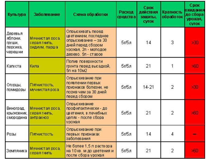 Il est important de se rappeler que la durée du médicament sur la plante est d'environ un mois. Si, passé ce délai, la culture a été attaquée par un champignon, le traitement doit être prolongé.