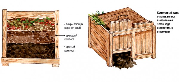 Lors du choix d'une installation de tiroir, peu importe que la surface soit plane ou surélevée. Il est conseillé de préparer un emplacement pour le tas de compost légèrement au-dessus du niveau du sol. Une telle mesure est nécessaire pour que le sol ne soit pas emporté. De plus, une grande boîte doit être fabriquée à partir d'une barre ou d'une planche, tout en laissant des espaces entre les bandes pour l'accès à l'oxygène. Nous installons les supports et trois murs prêts à l'emploi de la boîte dans un endroit permanent. Nous rendons le quatrième mur amovible afin qu'il soit pratique de remuer et d'extraire l'engrais. Au fond de la fosse, vous pouvez mettre une feuille de vieux linoléum.