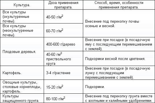 - les cultures horticoles sont nourries à raison de 40-50 g / m². m, le sol appauvri est fertilisé à raison de 70 g / m². m