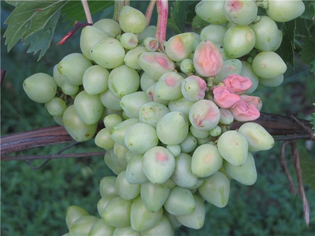 Les maladies du raisin dans notre article sont également représentées par une autre maladie dangereuse appelée oïdium (oïdium). Cette maladie, comme la précédente, a été importée d'Amérique du Nord, et déjà en 1852 elle a causé beaucoup de problèmes dans le secteur viticole de la France. Sa présence est attestée par des signes tels que des pousses aux feuilles frisées, à la traîne en termes de croissance et de développement, et recouvertes d'une floraison blanc grisâtre sur le dessus. Bientôt, les grappes malades commencent à mourir et les baies deviennent sèches, ce qui est très bien illustré sur la photo.