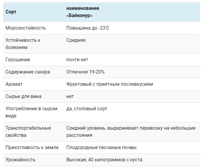 Le cépage Baïkonour a un certain nombre de qualités positives et négatives :