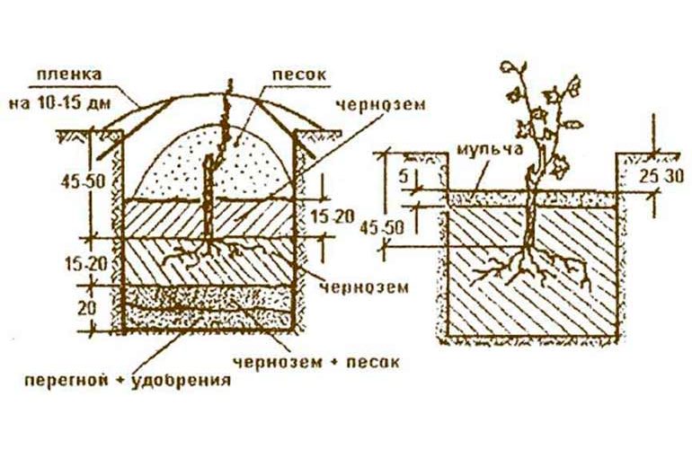La fosse d'atterrissage est préparée à l'avance. Le fond de la fosse est aménagé avec de la brique brisée, de l'argile expansée ou du gravier. Un système de drainage est nécessaire pour éliminer l'excès d'humidité. Ensuite, un mélange nutritif est introduit, composé de sable de rivière, de tourbe et de fumier pourri.