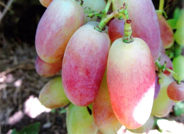 Le raisin julien - produit de l'activité d'un éleveur amateur, a été obtenu grâce au croisement des variétés Kesha et Rizamat, dont il n'a hérité que les meilleures caractéristiques. Julian est une variété précoce (on pourrait même dire très précoce), du début de la floraison à la maturation des fruits, une période de 95-105 jours s'écoule, c'est-à-dire que la récolte peut être récoltée dès la première décade d'août. Ses grappes sont lâches, grosses, parfois très grosses (le poids moyen des grappes est de 700 à 1 000 g et, avec un soin très précis, elles peuvent peser de 1,4 à 2 kg). Le pédoncule est long, la grappe est soit informe, soit ressemble vaguement à une cylindro-conique, c'est une similitude significative avec le cépage Rizamat parental. Pour correspondre aux grappes et aux baies de Julian - grandes, en forme de doigt, pèsent de 15 à 20 g. La couleur rose est légèrement diluée avec une teinte jaune, il y a des baies et plus foncées - lilas. La pulpe est croustillante et dense, avec une peau très fine (quand elle est consommée, elle n'est pratiquement pas ressentie), le goût harmonieux est complété par un léger arôme de muscade. Les baies ne sont pas sujettes à la fissuration, elles ont une bonne capacité de stockage du sucre, tandis que les guêpes ne sont pas réellement endommagées.