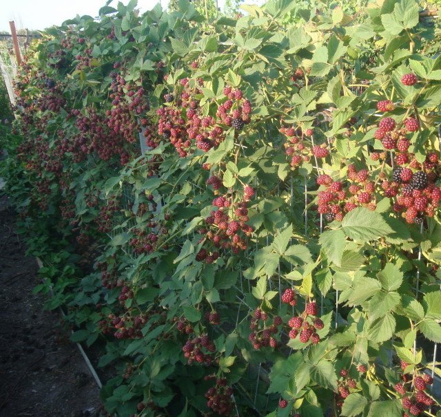 Un treillis en forme de V est fabriqué en rembourrant des bandes transversales au sommet d'une longueur de 70 à 80 cm.Le rendement des buissons sur une telle structure est plus élevé, car la pénétration de l'air et de la lumière du soleil est bien meilleure, le buisson semble ouvert vers le soleil. À l'aide de tels treillis, ils organisent une haie de mûres.
