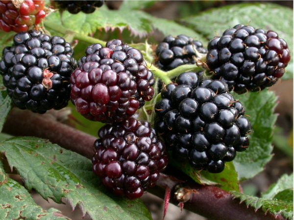 Un mois plus tard, les fruits de variétés telles que "Loch Tay", "Polar", "Netchez" commencent à mûrir. De plus, la variété anglaise "Loch Tay" donne des fruits pendant seulement 2 semaines, ce qui n'est pas très typique des mûres avec leur période de fructification prolongée. Ses pousses sont semi-dressées et les baies sont ovales noires.