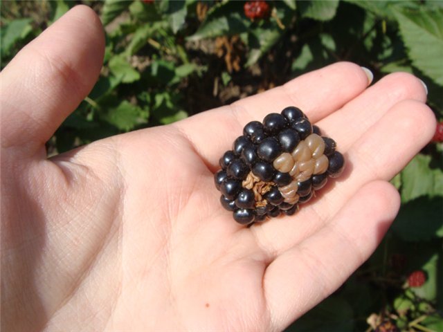 Compléter l'examen d'aujourd'hui du cultivar de mûre sans épines Merton Thornless est une plante rampante avec de puissantes pousses à facettes sans épines. La culture est considérée comme résistante à l'hiver : elle peut tolérer des gelées jusqu'à -30 degrés. L'arbuste est résistant aux maladies, rarement affecté par les ravageurs. Forme une grande grappe multiple d'ovaires - jusqu'à 50 baies de taille moyenne au goût aigre-doux. Fructification de début août à fin septembre, vous permettant de récolter jusqu'à 10 kilogrammes de baies de chaque buisson. Les fruits se distinguent par d'excellentes qualités - ils ne se froissent pas, ne perdent pas longtemps leur présentation.