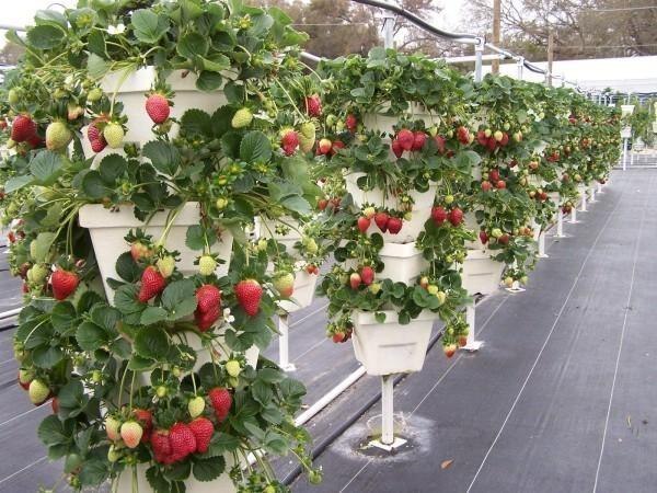 Un autre type de parterres de fraises à plusieurs niveaux, et en fait pas tout à fait un parterre de jardin, consiste à faire pousser des fraises dans des boîtes ou des pots fixés sur des poteaux spéciaux ou même une clôture, similaires aux pots de fleurs décoratifs. Il est encore plus facile d'assembler une telle structure de vos propres mains qu'un lit à plusieurs niveaux capital.La hauteur des pots de culture doit être d'environ 20 à 40 cm.Le drainage doit être posé au fond des pots, les pots doivent être remplis d'un mélange de terre, de tourbe et d'humus, et arrosés au besoin.