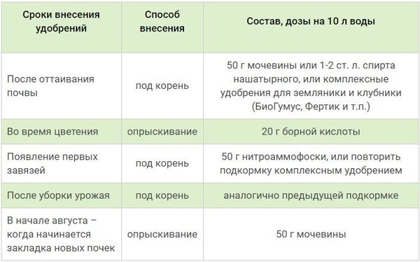 Le schéma d'alimentation est standard: au printemps - un complexe azote-minéral, pendant la floraison - une infusion d'herbes, une solution d'acide borique et un peu de cendre. Les boutons floraux sont déposés en août. Pendant cette période, les buissons doivent être traités à l'urée (50 g / 10 l). Avant l'hivernage, les lits sont paillés avec de la matière organique.