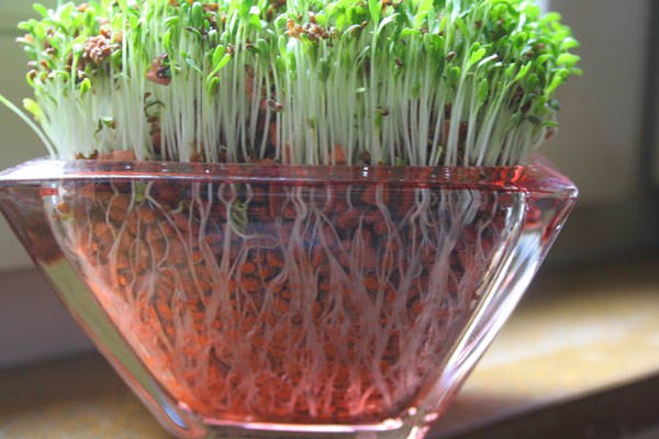 Si vous le souhaitez, vous pouvez vous passer d'un chiffon. La façon la plus amusante de faire pousser est de semer des graines de cresson dans une passoire à thé, de la mettre dans une tasse et de la verser avec de l'eau tiède et décantée de sorte que le fond de la passoire touche la surface de l'eau. Des pousses amicales devraient apparaître dans quelques jours. L'essentiel est de ne pas oublier de les asperger d'eau (ou de l'ajouter dans la tasse), de les retourner à 180 degrés quotidiennement et de les garder à l'abri de la chaleur.